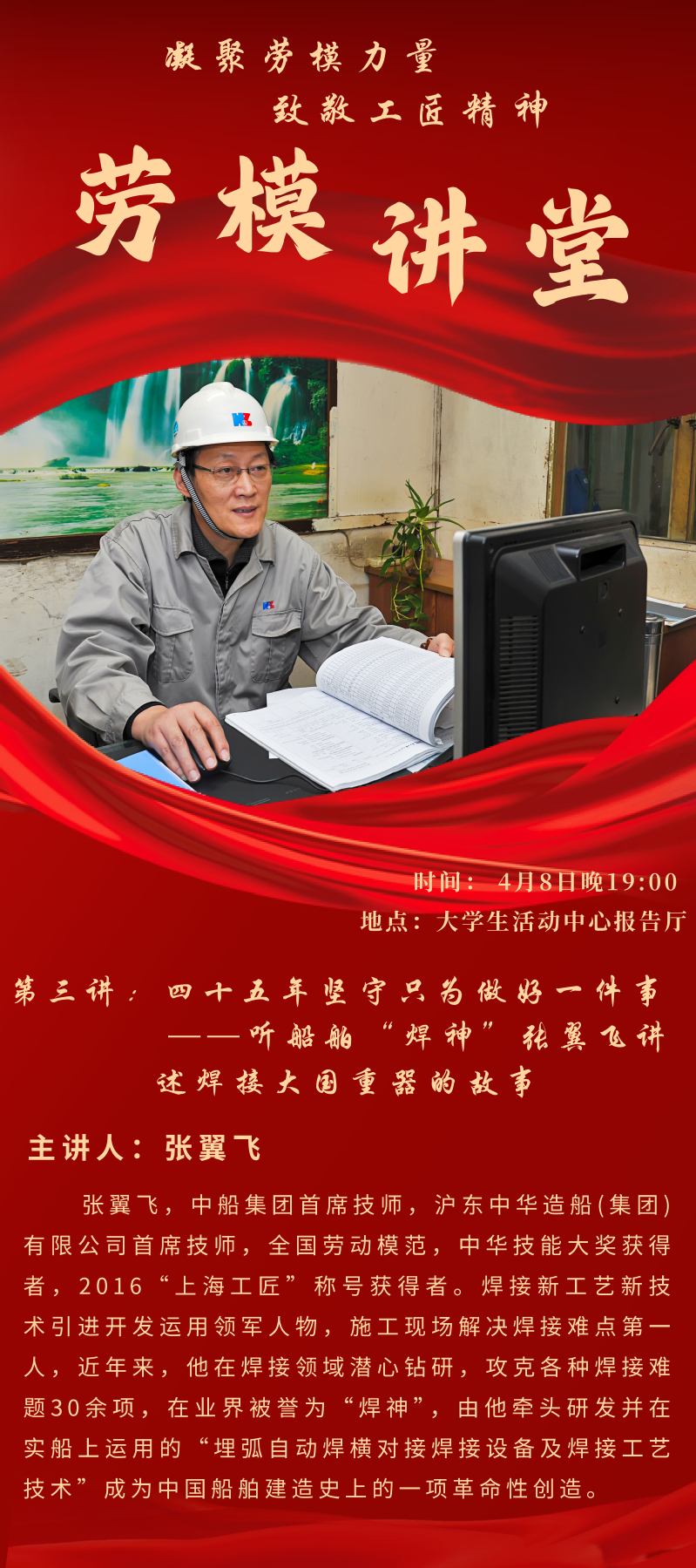 本期“劳模讲堂”邀请到全国劳动模范、中船集团首席技师、沪东中华造船(集团)有限公司首席技师张翼飞作专题报告。