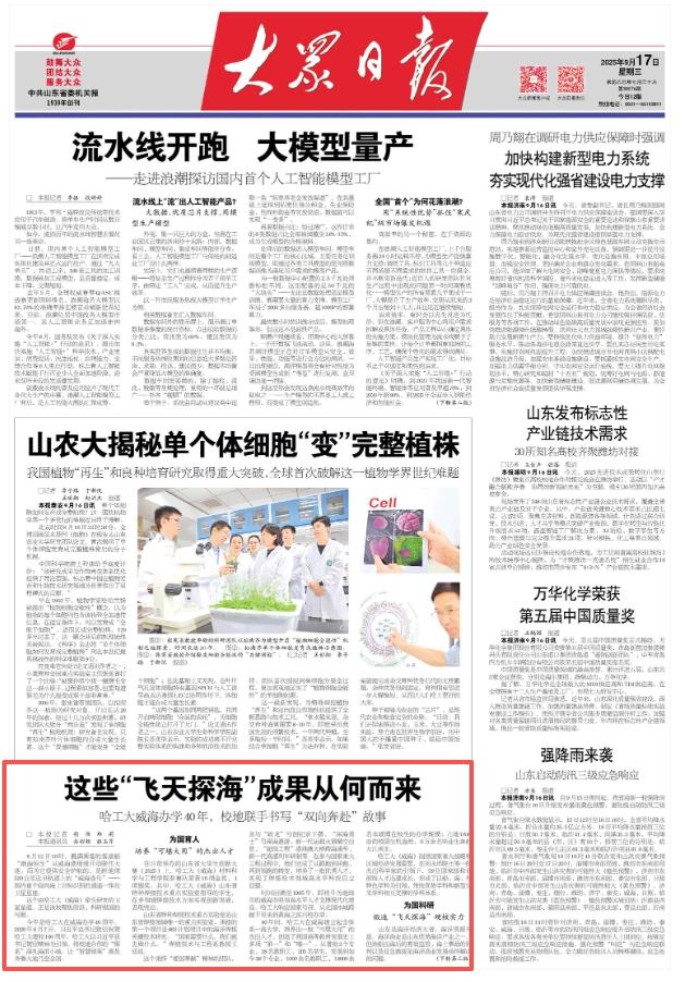 9月17日,《大众日报》以《这些“飞天探海”成果从何而来——哈工大威海办学40年,校地联手书写“双向奔赴”故事》为题,报道哈工大在威海办学40年的探索与成就。