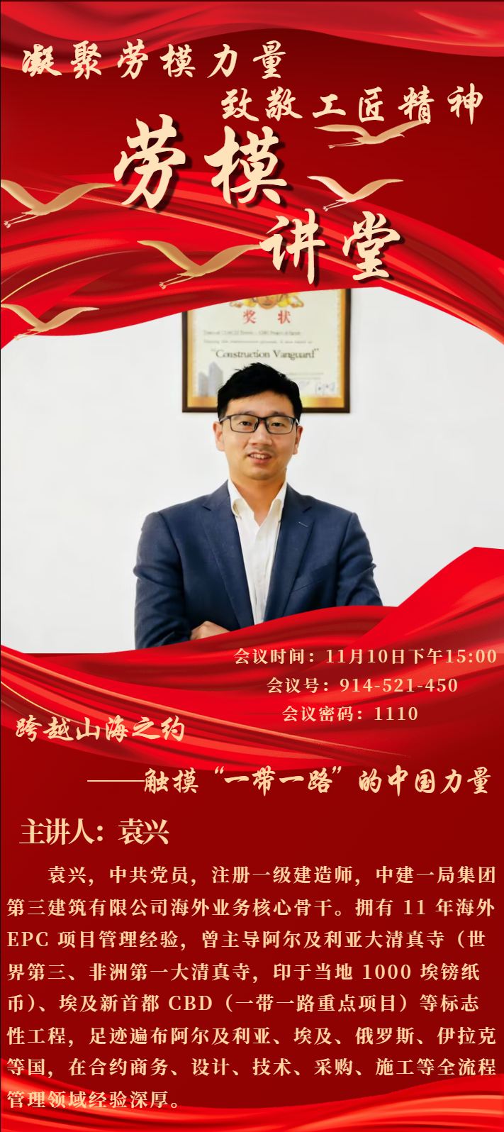 本期“劳模讲堂”邀请到中建一局集团第三建筑有限公司海外业务核心骨干、注册一级建造师袁兴作专题报告。