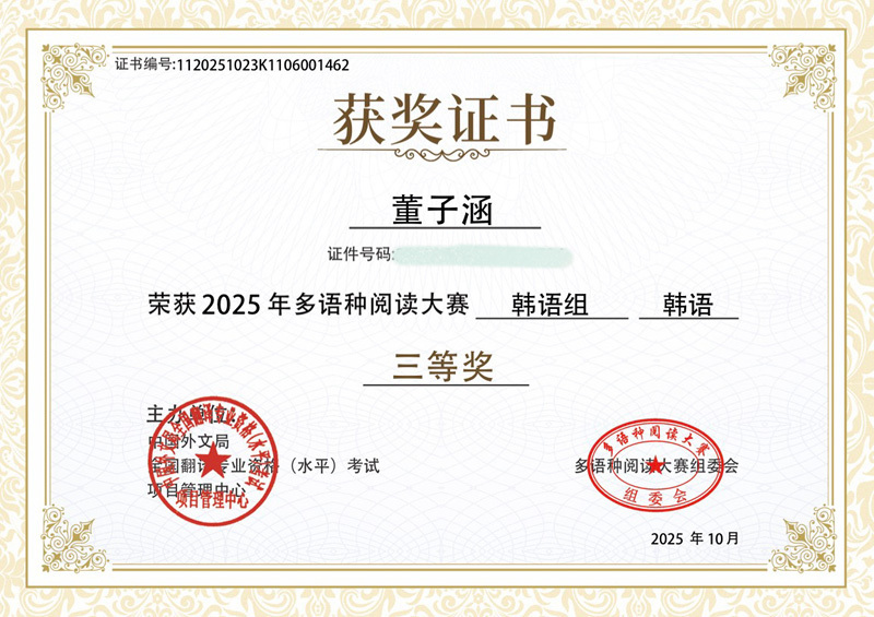 此外,在《2025年多语种阅读大赛(韩语组)》中,董子涵同学再次凭借优异的韩语阅读理解与语言运用能力,获全国三等奖。