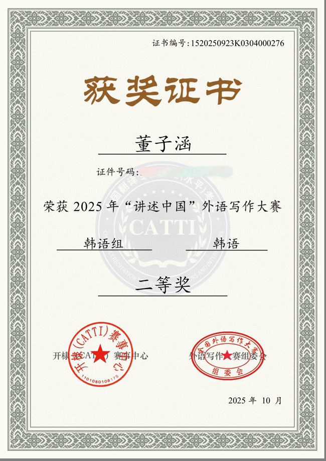 在《2025年“讲述中国”外语写作大赛(韩语组)》中,董子涵同学获全国二等奖。董子涵同学的韩语参赛文章以“开放的中国,中外友好交流的新篇章”为题,围绕中外民间交流新趋势,从多角度阐述了如何通过真实的文化展示与深度的民间互动,促进中外文明互鉴。