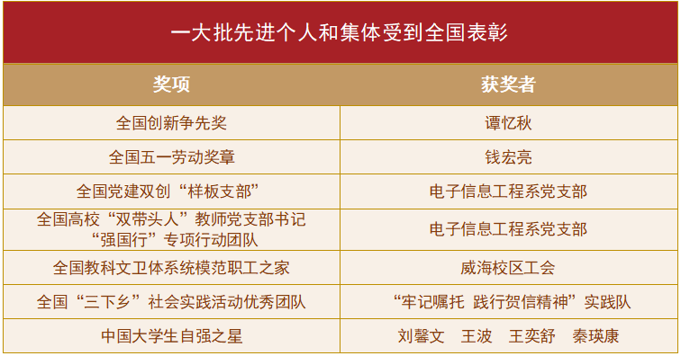 大力弘扬教育家精神、科学家精神,培育新时代哈工大“八百壮士”,涌现出一批国家级、省级先进个人和集体典型。材料科学与工程、海洋工程两个教师团队入选山东省高校黄大年式教师团队。谭忆秋教授获全国创新争先奖,钱宏亮教授荣获全国五一劳动奖章,于长军教授获评齐鲁最美教师,张鹏、桂洪斌两位教授获评山东省教学名师。