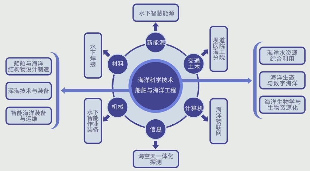 建立以“船、海”为引领的学科发展体系,推动特色学科建设“深度向海”,引导传统优势学科“积极涉海”,形成特色学科引领、传统优势学科与新兴交叉学科相互支撑的学科群体系。海洋科学获批一级学科博士点,入选山东省“优势特色学科”。牵头获批省部级以上科研平台8个。承办海洋科学与技术国际会议、中欧膜技术产业创新合作大会、全国空间智能遥感与海洋测绘导航大会、商业航天与低空经济论坛等高层次学术会议,促进海洋技术与装备产业产学研用一体化发展。