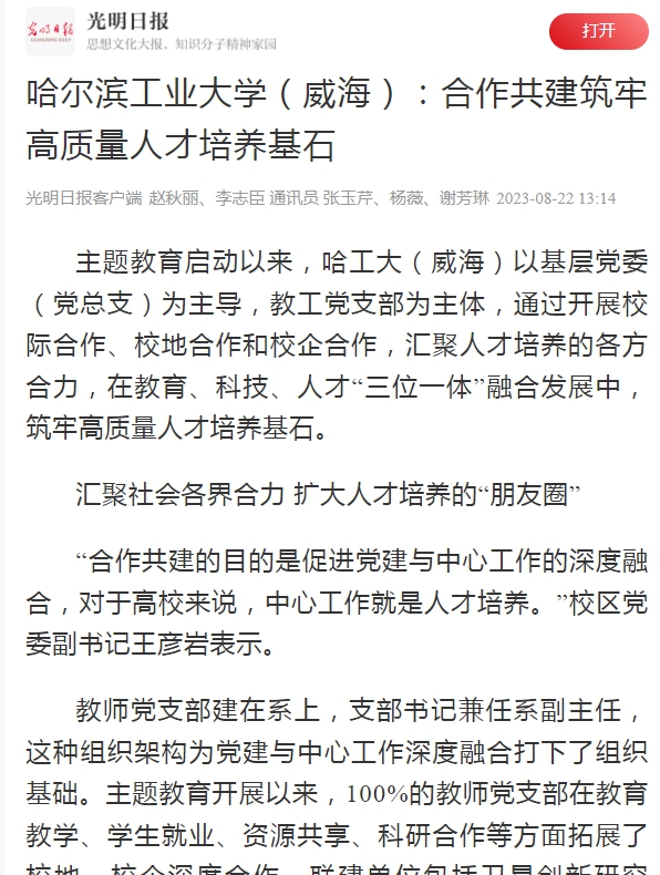与威海市、高新区共同创办哈工大威海创新创业园,打造新型校地联合协同发展共同体,孵化高科技企业50余家,已成为国家区域(威海)创新中心四大平台之一。与青岛市城阳区共建青岛创新发展基地,吸引一校三区23个科研团队入驻,与青岛市50多家企业开展合作70余项。发挥工科优势、赋能山东省头部企业发展,与潍柴、海尔、广泰空港、歌尔、光威等300余家企业开展广泛合作、提供关键技术支持,为区域经济发展贡献“哈工大方案”。