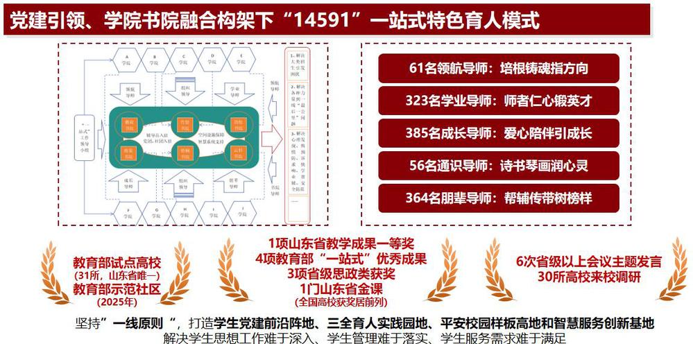 坚持“学院+书院”育人模式,建设十纵六横的“一站式”学生社区,2021年被确定为教育部试点单位,2025年获评全国高校示范“一站式”学生社区,1门社区课程获评山东省学校思政“金课”。