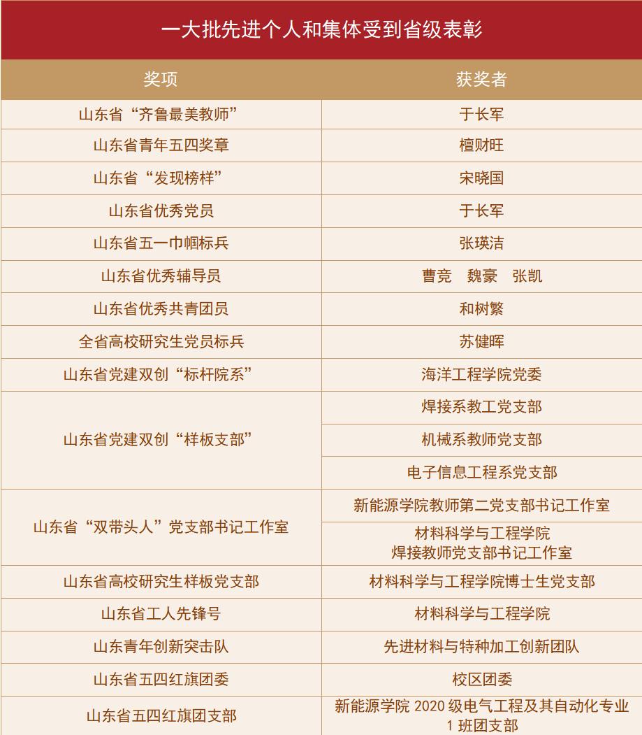 大力弘扬教育家精神、科学家精神,培育新时代哈工大“八百壮士”,涌现出一批国家级、省级先进个人和集体典型。材料科学与工程、海洋工程两个教师团队入选山东省高校黄大年式教师团队。谭忆秋教授获全国创新争先奖,钱宏亮教授荣获全国五一劳动奖章,于长军教授获评齐鲁最美教师,张鹏、桂洪斌两位教授获评山东省教学名师。