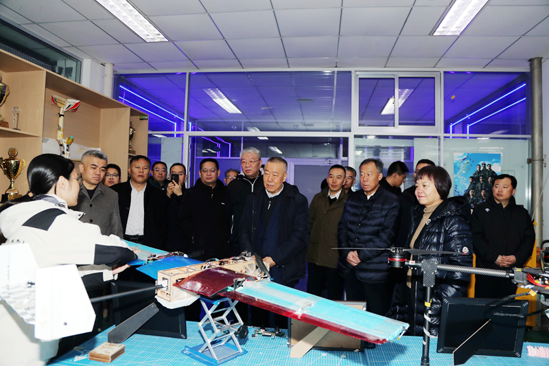 在大学生创新创业基地,调研评估组参观了无人机实验室、HRT车队等学生创新实验室,对校区的学生创新创业教育模式、成果给予高度赞誉。