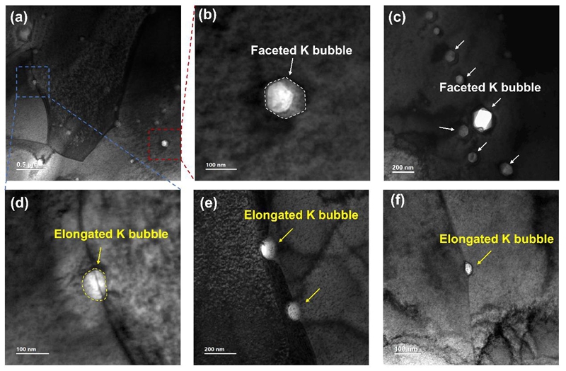 钨(W)具有高熔点、高溅射阈值、高热导、低氚滞留等优点,被视为核聚变堆面向等离子体材料的理想候选。然而钨的实际应用受限于较低的再结晶温度和高温下的显著晶粒长大,为提升其性能,常引入钾元素以形成稳定钾泡来钉扎晶界,从而抑制晶粒长大。掺钾钨材料虽已在实验中表现出卓越的热稳定性,但其微观机制不明,制约了材料的设计与性能优化。